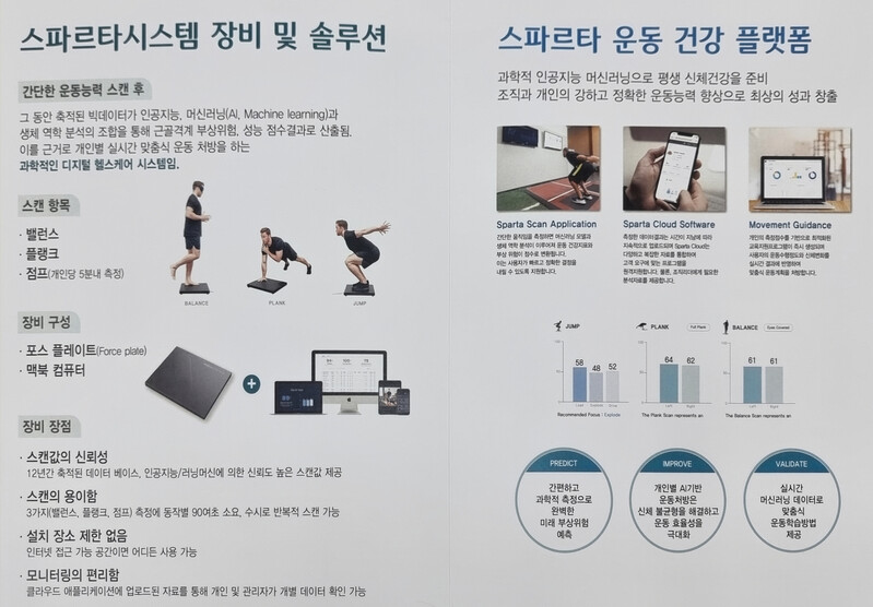 ‘스파르타 사이언스’는 간편하고 과학적인 운동 측정 시스템이다. 이를 토대로 부상의 위험을 완벽히 예측한다. 그 후 AI 및 빅 데이터를 기반으로 개인에게 맞는 운동 처방을 내리고, 운동 처방을 받은 개인은 자신에게 주어진 운동 방법을 소화한다. 그렇게 신체 불균형을 해결하고, 운동 효율성을 극대화해 건강 지수도 끌어올린다.