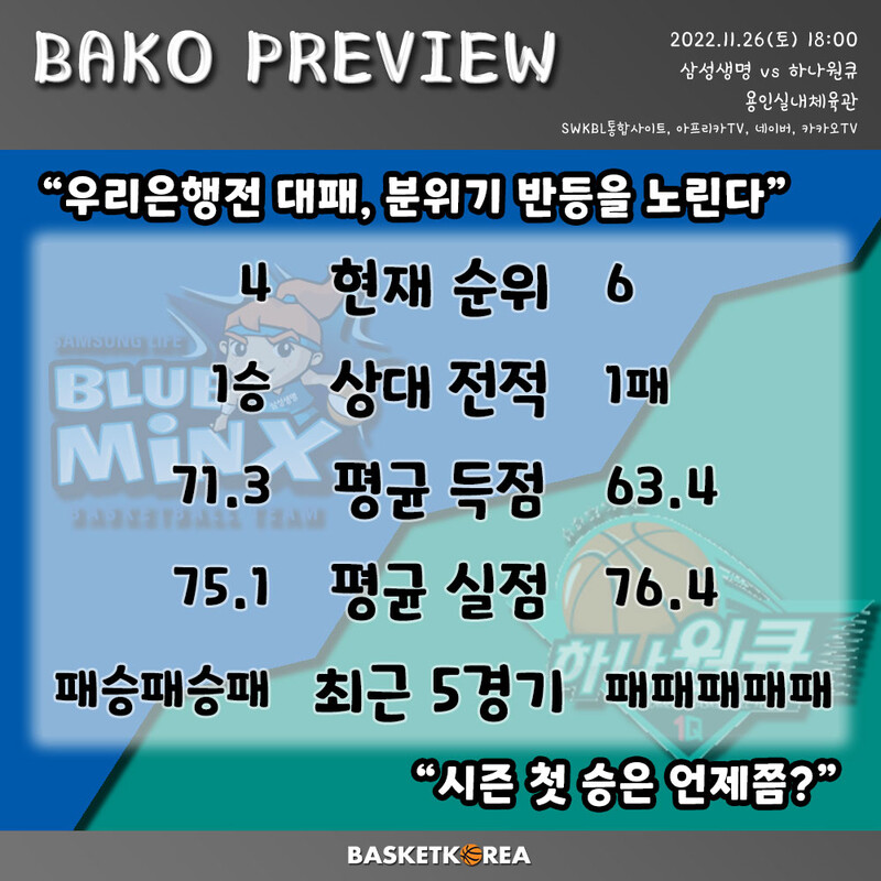 오늘 경기 삼성생명의 키 포인트는 분위기 반전을 노리는 것이고, 하나원큐의 키 포인트는 시즌 첫 승을 할 수 있을지이다.