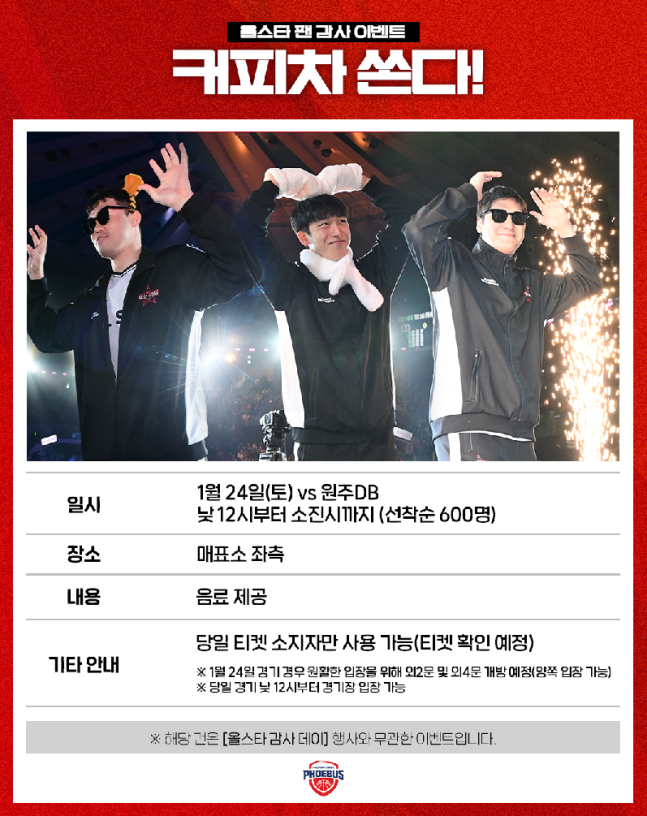 이번 커피차는 올스타에 선정된 세 명의 선수가 팬의 성원에 보답하기 위해 마련한 자리로 선착순 600명의 팬에게 커피차 음료를 제공한다. 박무빈은 “올스타에 선정된 것은 매우 영광스러운 일이며, 이 자리에 설 수 있었던 것은 전부 팬분들 덕분이라고 생각한다”라며 “감사의 마음을 전하고 싶었는데, 구단에서 자리를 마련해 주셔서 감사하다. 팬분들께서 부담 없이 드셔 주셨으면 좋겠다”고 밝혔다.