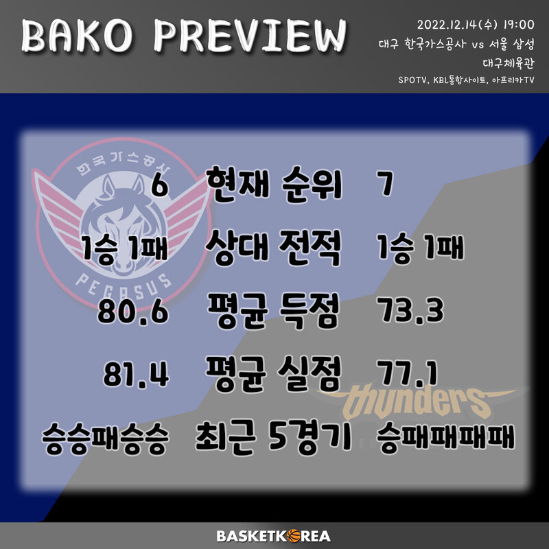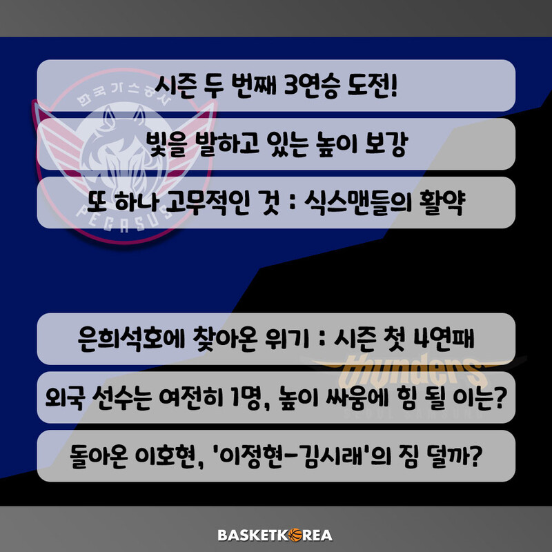 오늘 경기 가스공사는 시즌 두번째 3연승에 도전한다. 높이 강화가 빛을 발하고 있고, 식스맨들의 활약이 고무적이다.