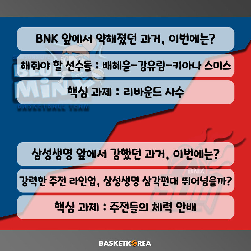 오늘 경기 삼성생명의 핵심 과제는 리바운드 사수이다. 배혜윤-강유림-키아나 스미스 삼각 편대의 활약이 중요하다.
