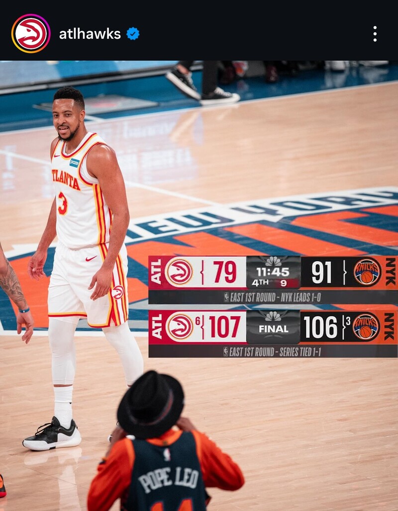 애틀란타 호크스는 21일(한국시간) 뉴욕 매디슨 스퀘어 가든에서 열린 2025~2026 NBA 플레이오프 동부 컨퍼런스 1라운드 2차전에서 107-106으로 뉴욕 닉스를 꺾었다. 1승 1패로 균형을 맞췄다.