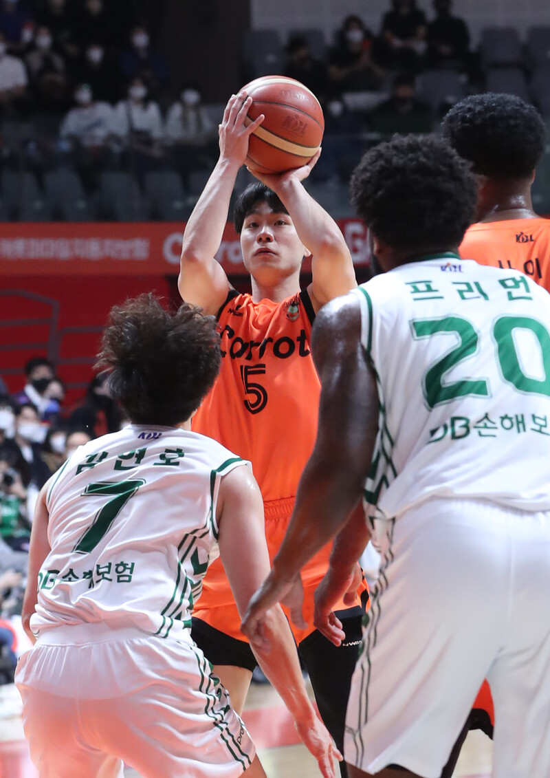 캐롯이 4쿼터에 쫓길 때, 한호빈의 대담함이 더 강하게 드러났다. 캐롯이 73-65로 쫓길 때, 한호빈은 오른쪽 45도에서 달아나는 3점을 터뜨렸다. 또, 캐롯이 78-70으로 쫓기자, 한호빈이 왼쪽 45도에서 3점을 성공했다. 남은 시간은 4분 11초, 캐롯은 두 자리 점수 차(81-70)로 DB와 멀어졌다.
