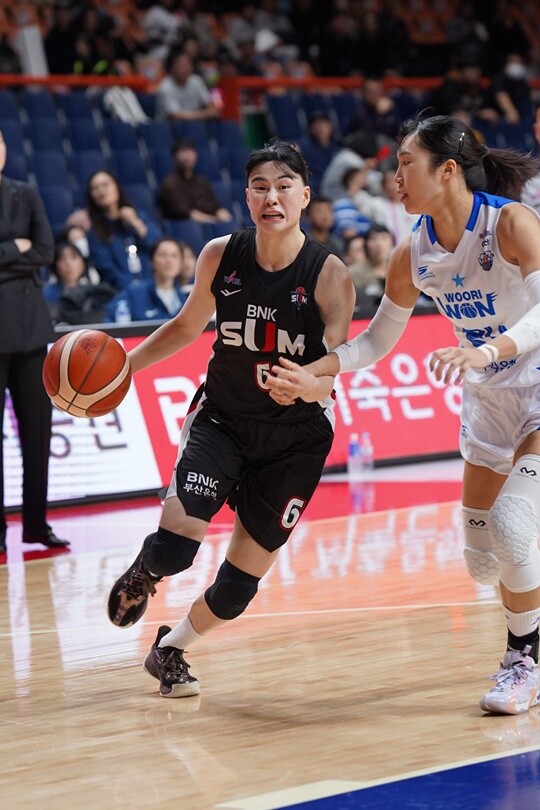 부산 BNK는 21일 부산 사직실내체육관에서 열린 BNK금융 2025~2026 여자프로농구 정규리그 경기에서 아산 우리은행을 65-63으로 꺾었다. 10승 8패로 3위를 유지했다. 4위 우리은행(8승 9패)와 1.5게임 차를 기록했다.