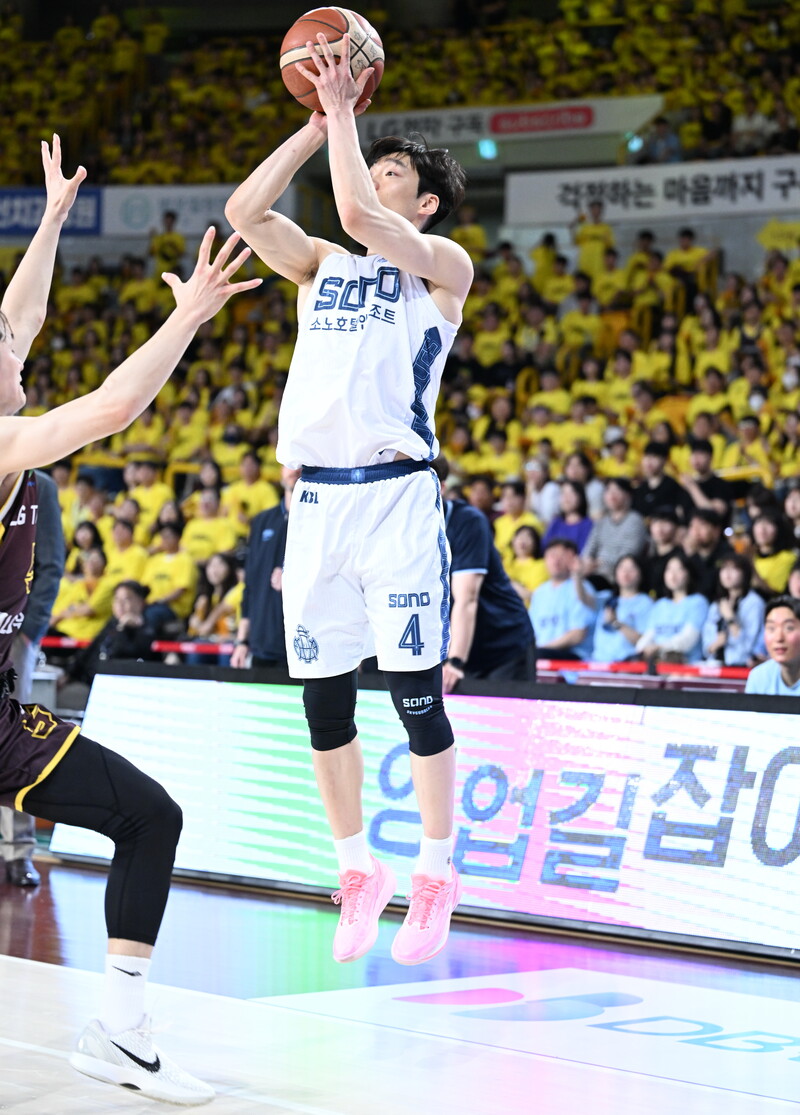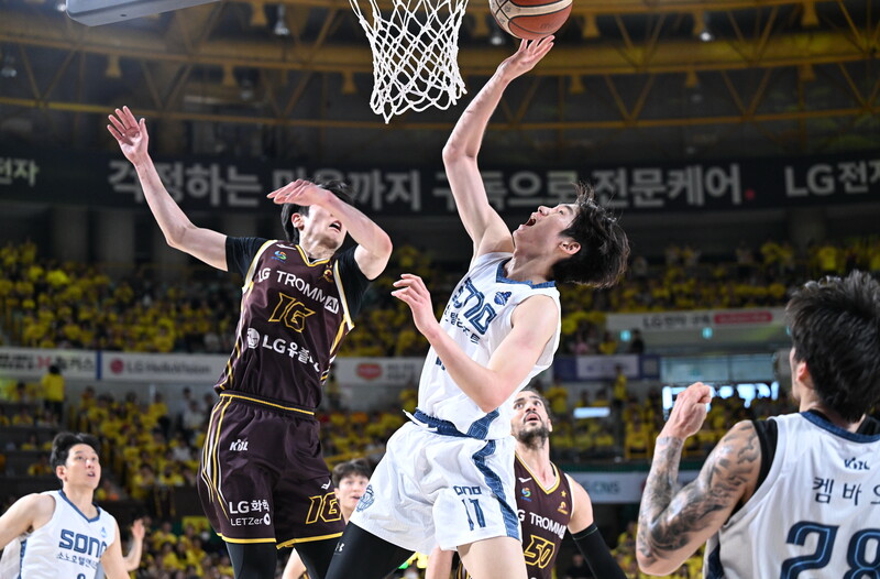 이날도 소노는 전반 내내 LG에 끌려다녔다. 전반 한때 14점 차까지 벌어진 격차, 그러나 소노는 1차전의 15점 차 역전에 이어 또다시 대역전극을 완성했다. 그리고 그 흐름을 처음으로 뒤집은 건 팀의 막내 이근준이었다.