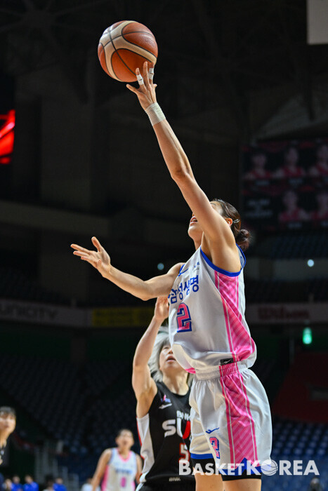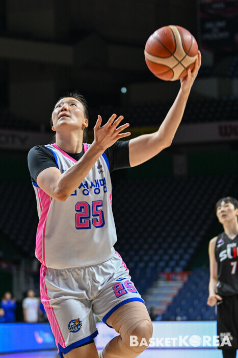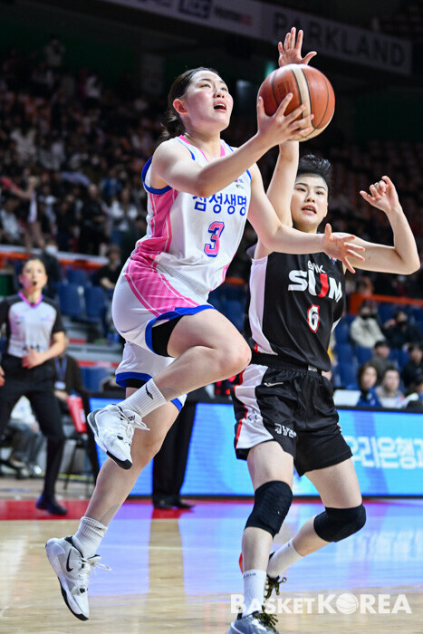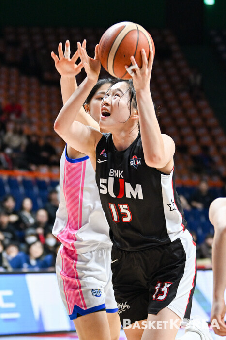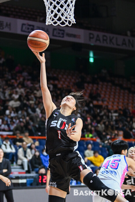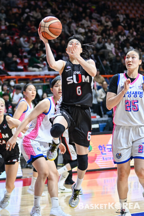 골밑으로 달려들어 레이업 시도하는 BNK 변소정