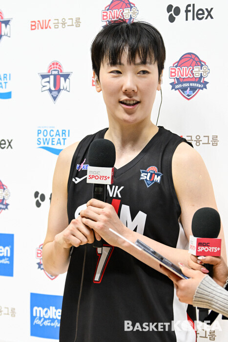 접전 끝 승리를 차지한 후 밝은 표정으로 인터뷰에 응하는 BNK 박혜진