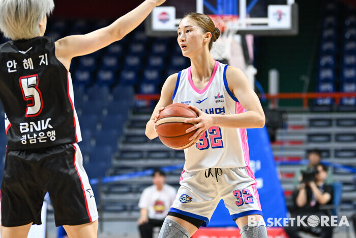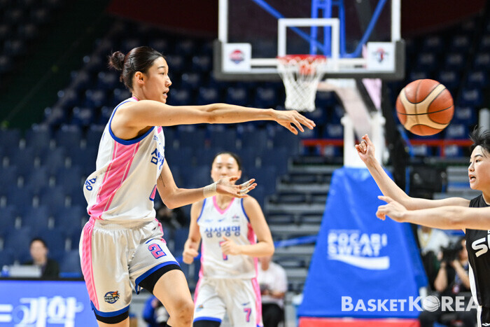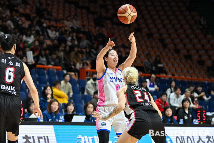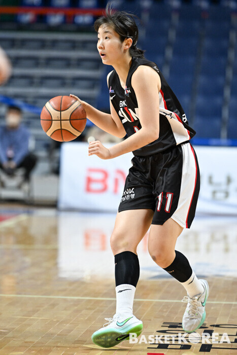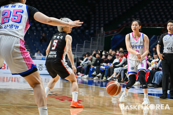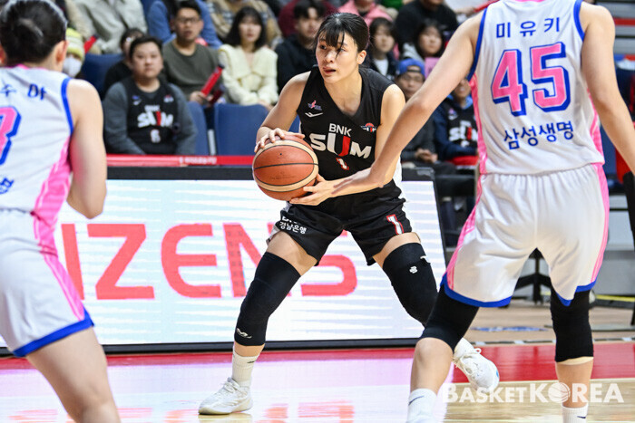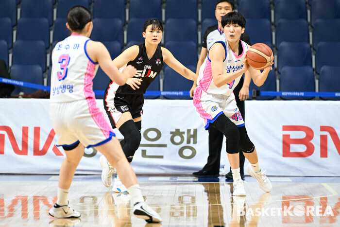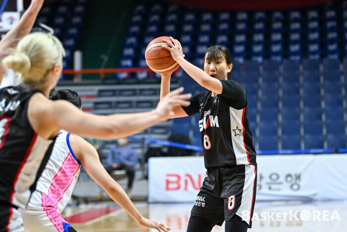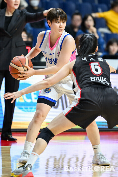 안쪽의 김소니아에게 패스 연결하려 하는 BNK 이원정