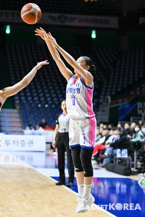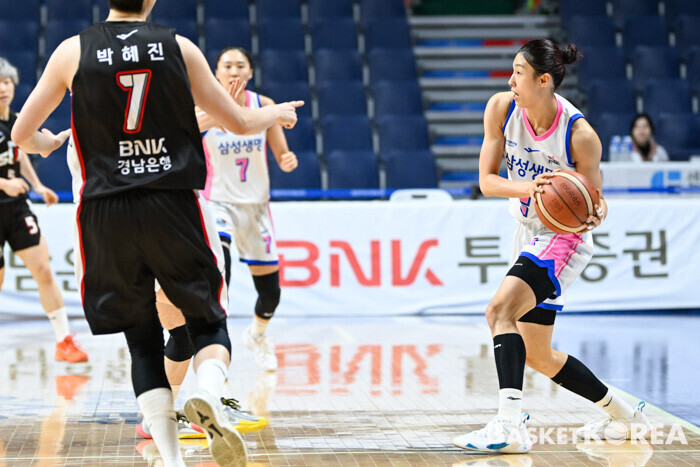 BNK 변소정의 수비에 아랑곳않고 슛 시도하는 삼성생명 윤예빈