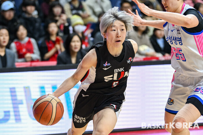 상대 수비를 피해 낮고 빠르게 돌파 시도하는 BNK 안혜지