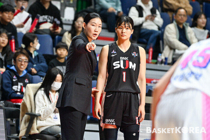 변소정에게 작전 지시하는 BNK 박정은 감독