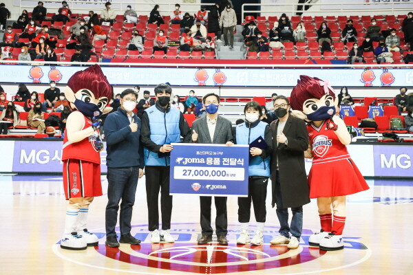 현대모비스는 30일 홈경기 하프타임에 뜻깊은 전달식을 진행했다. 바로 울산대 남·녀 농구부에 ‘운동용품’을 지원한다는 것. 현대모비스 이승민 단장은 울산대 농구부 주장들과 함께 기념촬영 및 운동용품을 전달했다. 약 2,700만원 상당의 JOMA 트레이닝복, 운동화 등 훈련에 있어서 꼭 필요한 용품들이었다.