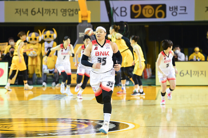 분위기를 바꿔야 했다. 그러나 쉽지 않았다. 박지수가 공격과 수비 모두 각성했기 때문이다. 김한별의 노련함과 힘, 센스 모두 통하지 않았고, BNK 역시 39-56으로 밀렸다. 김한별은 3쿼터 종료 4분 21초 전 벤치로 물러났다.