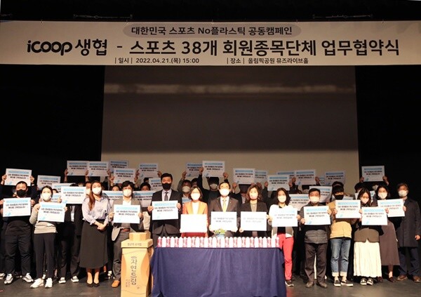 대한민국농구협회(회장 권혁운)가 4월 22일 지구의 날을 기념해 21일 올림픽공원 내 뮤즈라이브홀에서 아이쿱생협과 ‘No플라스틱 공동캠페인’을 위한 업무 협약을 체결했다.