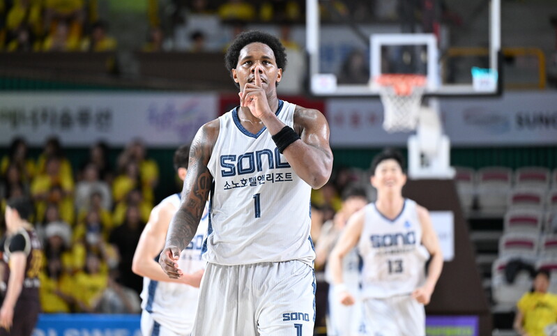 주도권이 완전히 소노로 넘어온 시점, 나이트는 승부에 확실한 쐐기를 박았다. 82-71로 앞선 경기 종료 1분 29초 전, 나이트가 마레이를 앞에 두고 던진 스텝백 3점슛이 그대로 림을 갈랐다. 나이트는 손가락을 입술에 대는 세리머니를 펼쳤고, 창원체육관은 조용하게 얼어붙었다. 이어 나이트는 소노 원정 팬들을 바라보며 환호성까지 이끌었다.