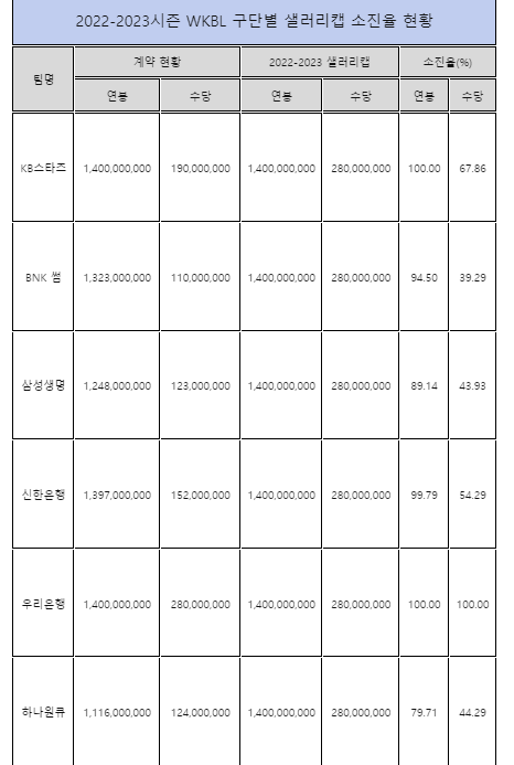 구단별 평균 샐러리캡 소진율은 연봉 93.86%, 수당 58.27%다. 우리은행은 연봉과 수당 100% 소진했으며, 하나원큐는 연봉에서 가장 낮은 79.71%, BNK는 수당에서 가장 낮은 39.29%의 소진했다.
