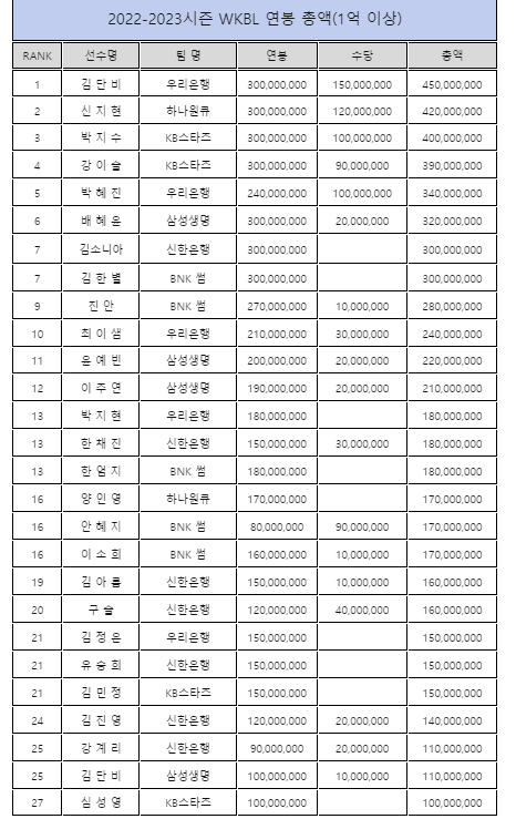 선수 연봉 상한선인 3억 원을 받는 선수는 지난 시즌보다 1명 늘어난 7명이다. 하나원큐 신지현은 총액 4억 2천만원으로 데뷔 이후 처음으로 연봉 3억 원을 받는 기쁨을 누렸다. 3년 보장 금액이다.