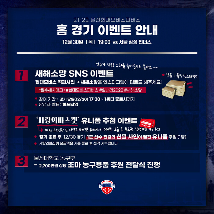 1월 1일엔 선수들이 직접 영상으로 새해 인사를 전하는 메세지카드를 입장 관중 선착순 1,000명에게 배포한다. 메시지카드엔 현대모비스 선수 중 1명의 새해 인사가 무작위로 들어있으며 QR코드를 통해 영상을 확인할 수 있다.