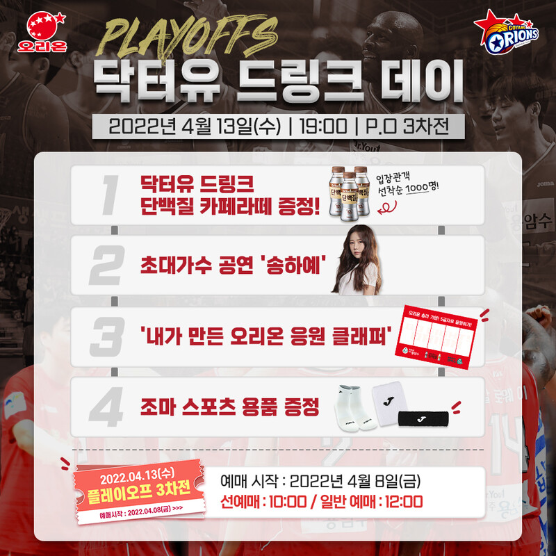 오리온은 플레이오프 첫 홈경기를 맞아 경기 당일 오후 5시부터 입장객 선착순 1000명에게 ‘닥터유 드링크 단백질 카페라떼’를 증정한다. 이와 함께 고양체육관 1층 응원부스에서는 응원문구를 직접 꾸며 넣을 수 있도록 특별히 제작한 ‘내가 만든 오리온 응원 클래퍼’도 제공한다.