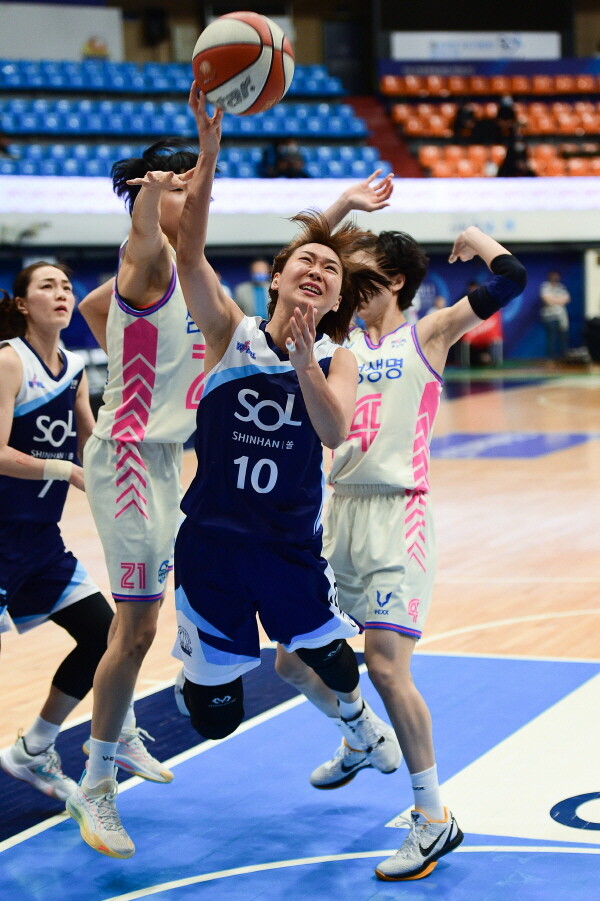유승희가 활약한 인천 신한은행은 12일 인천실내체육관에서 벌어진 2021-22 삼성생명 여자프로농구에서 김단비(11점 11리바운드 3어시스트 3스틸), 한채진(15점 10리바운드 4어시스트) 활약을 더해 배혜윤(22점 17리바운드 7어시스트), 이주연(17점 5리바운드 2어시스트), 이해란(3점 4리바운드 2스틸)이 분전한 용인 삼성생명을 접전 끝에 69-67로 이겼다.