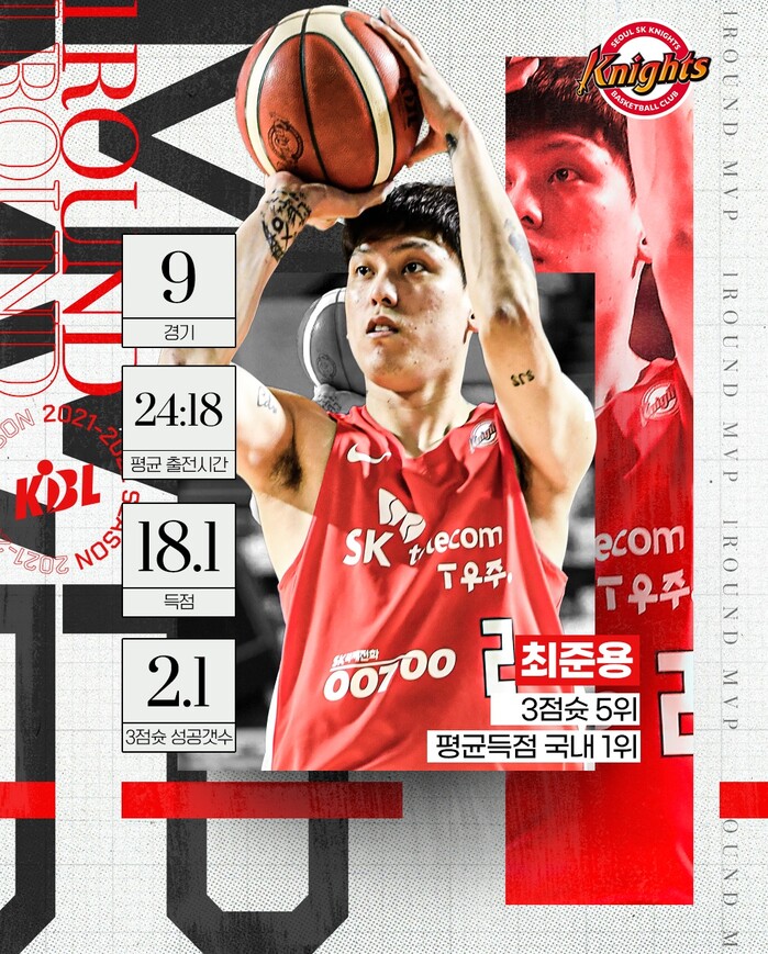 1라운드 9경기 동안 평균 24분 18초를 출전해 18.1득점(국내 1위/전체 5위)을 기록한 최준용은 1라운드 전 경기에서 두 자리 수 득점을 기록했다. 3점슛 또한 경기당 평균 2.1개를 성공시키며 해당 부문 전체 5위를 차지했다. 최준용의 활약을 업은 SK는 1라운드를 7승 2패로 마감하며 단독 1위에 올랐다.