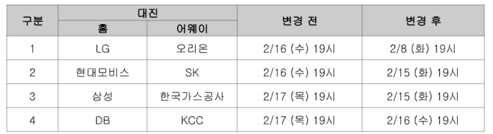 변경 대상 경기는 총 4 경기로, 2월 16일(수) 개최 예정이었던 창원 LG와 고양 오리온의 경기는 2월 8일(화)로, 울산 현대모비스와 서울 SK의 경기는 15일(화)로 변경된다. 2월 17일 개최 예정이던 서울 삼성과 대구 한국가스공사의 경기는 15일(화)로, 원주 DB와 전주 KCC의 경기는 16일 (수)로 변경됐다.