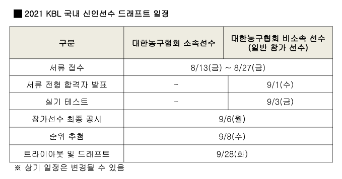 ‘2021 KBL 국내 신인선수 드래프트’는 9월 28일(화) 개최되며 세부사항은 추후 안내할 예정이다.