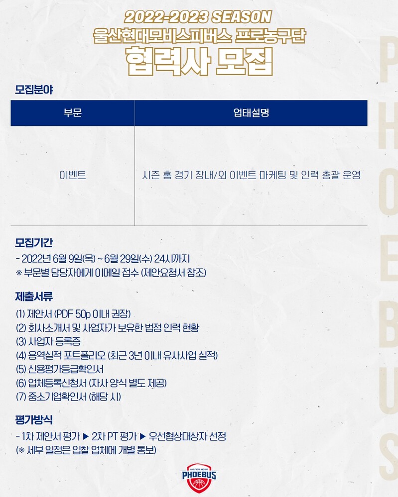 현대모비스는 9일부터 이벤트 부문 협력사 모집을 시작한다. 이번 모집을 통해 선정되는 이벤트 협력사는 2022-2023시즌 현대모비스 프로농구단 홈 경기 장내/외 이벤트 마케팅 및 인력 총괄 운영 업무를 담당하게 된다.