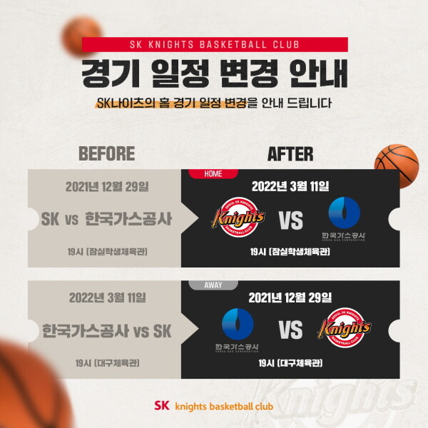 SK나이츠는 12월 29일(수) 오후 7시에 열릴 예정이던 한국가스공사와의 홈 경기가 체육관 사정으로 인해 2022년 3월 11일(금) 오후 7시로 변경됐다고 밝혔다. 이에 따라 당초 29일 홈 경기는 대구 원정 경기로 열릴 예정이다.