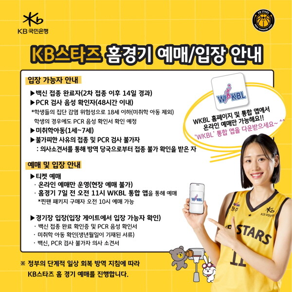 KB는 "시즌 첫 홈 경기인 21일 경기 예매는 『WKBL 통합 티켓 예매 애플리케이션과 WKBL 공식 홈페이지』를 통해 가능하며 전 좌석은 지정 좌석으로 판매한다.