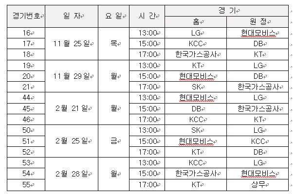 대상 경기는 FIBA 홈&원정 휴식기 中 11/25(목), 11/29(월), 2/21(월), 2/25(금), 2/28(월) 경기 시간이다.
