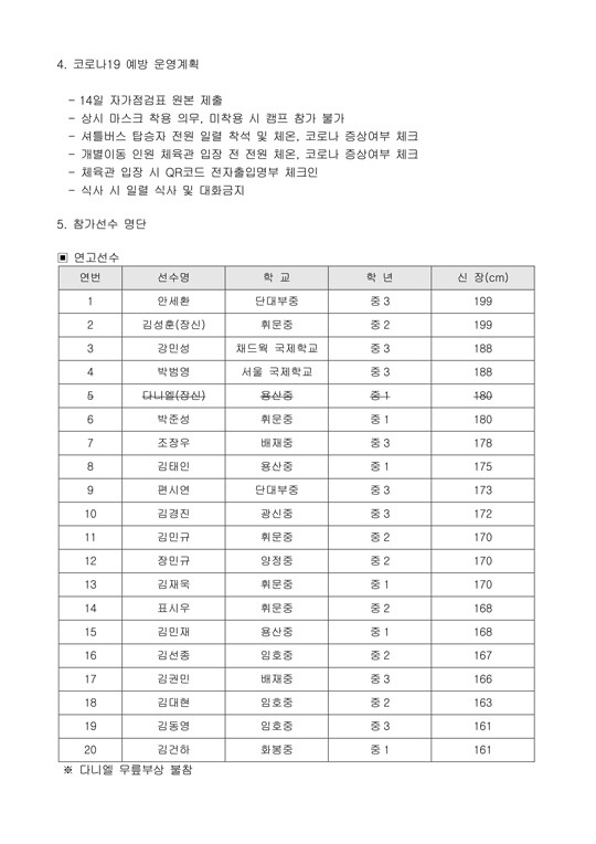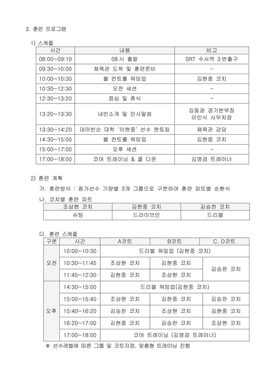 훈련 프로그램은 참가선수를 기량별 3개 그룹으로 구분해 파트별 [슈팅/드라이 브인/드리블] 순환식으로 진행된다.
