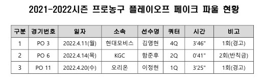 플레이오프를 포함한 2021-2022시즌 페이크 파울은 총 50건(정규경기 47건, 플레이오프 3건)으로 지난 시즌 총 103건(정규경기 96건, 플레이오프 7건)에 비해 대폭 감소했다. 구단으로는 서울 삼성이 8건으로 가장 많았고, 울산 현대모비스 이현민이 개인 최다인 3건의 페이크 파울을 기록했다.