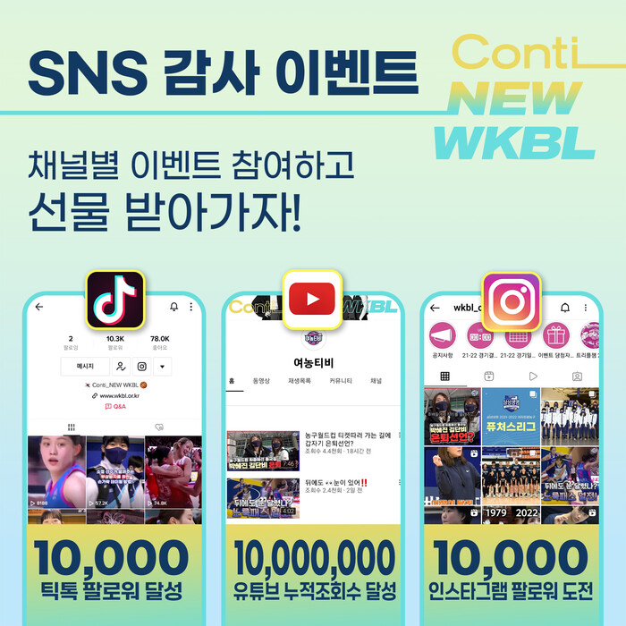 WKBL은 이를 기념하기 위해 각 SNS 채널별로 ‘ContiNEW WKBL SNS 감사 이벤트’를 연다. 틱톡에서는 오는 10일부터 28일까지 ‘채널명 공모전’을 개최한다. 이벤트 관련 영상에 댓글로 참여 가능하며, 당선작을 포함해 총 6명에게 5만 원 상당의 배달의민족 모바일 상품권 등 기프티콘을 증정한다.