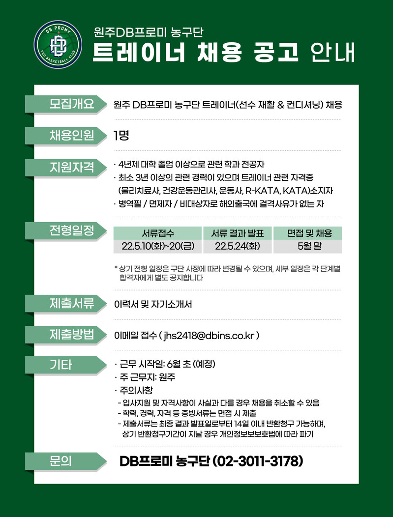 원주 DB프로미 프로농구단이 트레이너를 공개 채용한다.