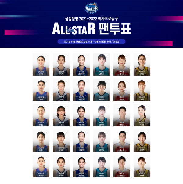 WKBL은 오는 24일부터 12월 13일까지 WKBL 공식 홈페이지(www.wkbl.or.kr)와 통합 애플리케이션을 통해 ‘삼성생명 2021~2022 여자프로농구 올스타전’ 팬 투표를 실시한다.