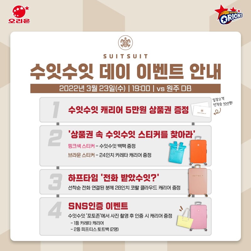 오리온은 경기 당일 오후 5시부터 경기장 2층 출입구에서 입장객 선착순 100명에게 수잇수잇 캐리어 5만 원 상품권을 증정한다. 작전 및 하프 타임 간에는 이벤트를 통해 백팩, 캐리어 등 수잇수잇의 다양한 제품을 경품으로 선물한다. 이벤트 관련 자세한 내용은 구단 SNS 채널을 통해 확인 가능하다.