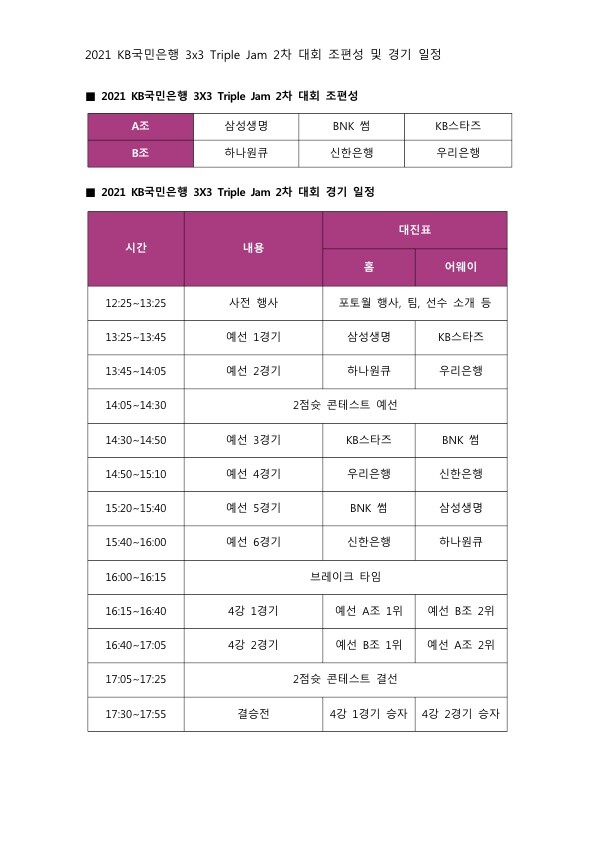 이번 대회는 6개 팀이 두 개조로 나뉜 가운데, A조에는 삼성생명, BNK 썸, KB스타즈가 포함됐고, B조에는 하나원큐, 신한은행, 우리은행이 편성됐다. 조별 예선을 치른 뒤, 각 조 1, 2위 팀이 4강 토너먼트를 통해 최종 우승팀을 가린다.