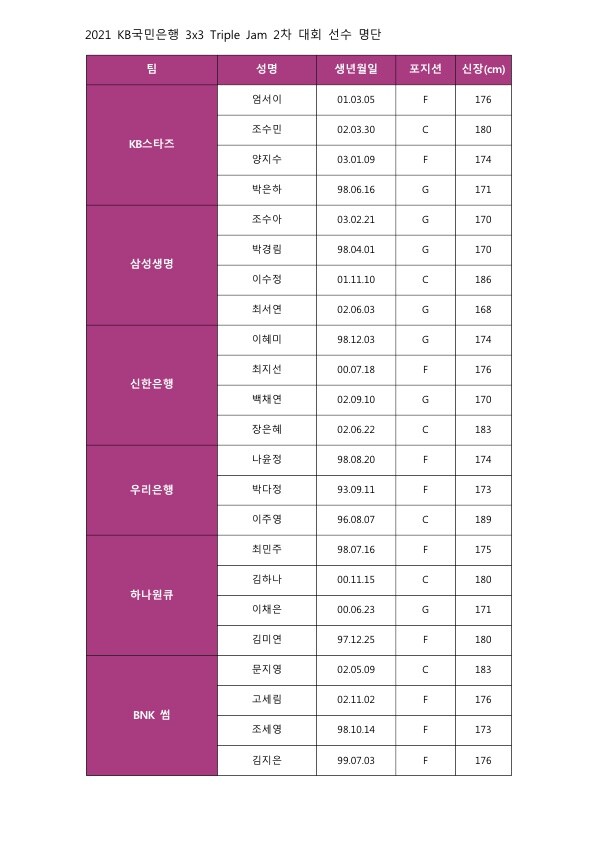올해 1차 대회 BNK 썸을 우승으로 이끌고 대회 MVP를 차지했던 김지은(BNK 썸)과 2020년 1차 대회 MVP 나윤정(우리은행) 등 MVP 출신 선수들도 이번 대회에 나서고, 이밖에 최서연(삼성생명), 이혜미(신한은행), 박다정(우리은행), 김미연(하나원큐), 엄서이(KB스타즈) 등 총 23명의 선수가 참가한다.
