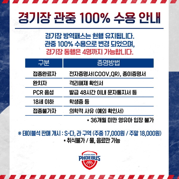 방역패스를 철저히 적용해 100% 관중 수용으로 1층 ‘S-다, 라’ 구역 테이블석 판매를 재개한다. 좌석에서는 음료를 제외한 취식은 불가하다.