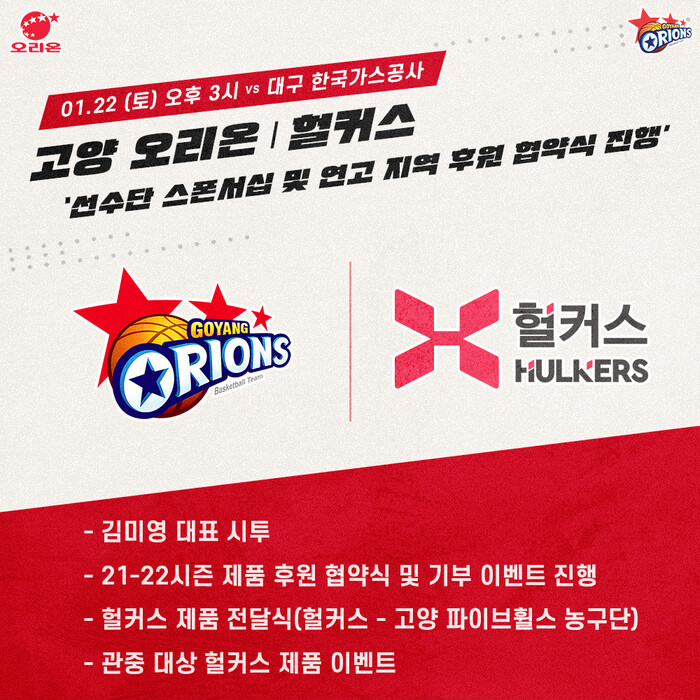 오리온과 헐커스는 지난 시즌에 이어 다시 한번 스폰서십을 이어간다. 선수들의 부상 관리 및 경기력 향상을 위해 MSM에너지원큐, MSM스포츠마사지 아이스겔, MSM스포츠마사지 크림을 지원하고, 오리온이 승리할 때마다 10만원 상당의 헐커스 제품을 적립해 연고지 내 스포츠를 좋아하는 청소년 단체에 기부할 계획이다. 이날 협약식에 앞서 2020-2021 시즌에 적립한 약 300만 원 상당의 헐커스 제품을 고양시 휠체어 농구단 ‘고양 파이브휠스’에 전달할 예정이다.