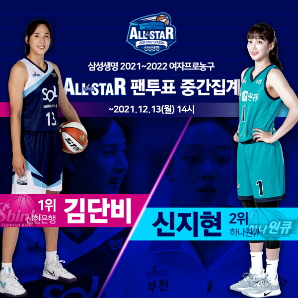 ‘삼성생명 2021~2022 여자프로농구 올스타’ 팬 투표 중간 집계 결과 김단비(신한은행)가 1위에 올랐다.