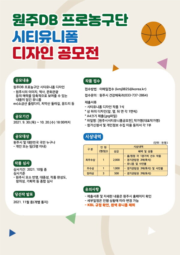 창의성, 기획력, 대중성 등의 종합 심사를 거쳐 최우수상 200만원 등 5작품을 선정할 예정이며, 최우수상 디자인은 원주DB의 유니폼으로 제작되어 올 시즌 홈.원정 각 1경기씩 입고 경기에 나설 예정이다.
