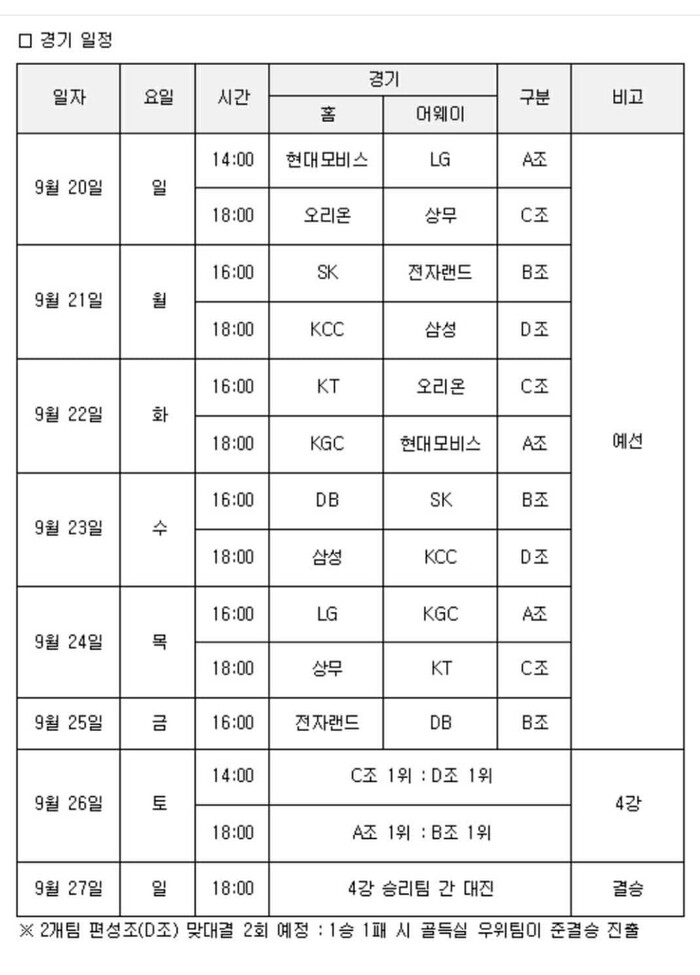9월 20일부터 27일까지 열리는 이번 대회는 KBL 10개 구단과 상무 등 총 11개 팀이 참가한다. 각 팀들은 4개 조로 나뉘어 예선을 펼치고 조 1위가 결선에 진출한다. 두 팀이 속한 D조는 백투백 매치로 1위를 결정한다.