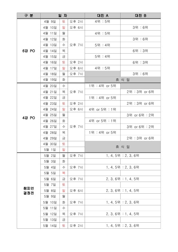 1위 팀과 4위 팀-5위 팀 승자 / 2위 팀과 3위 팀-6위 팀 승자의 대결로 진행되는 4강 플레이오프는 4월 20일(수)부터 4월 29일(금)까지 5전 3선승제로 운영된다.