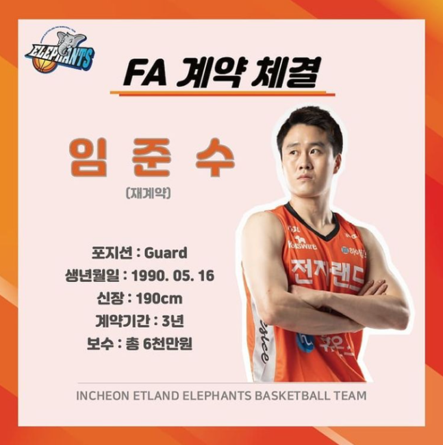 또한, 전자랜드는 팀 내 FA인 임준수와의 재계약도 발표했다. 계약기간은 3년이며, 보수는 총 6천만원이다. 지난 시즌 12경기를 뛰었지만, 임준수는 벤치에서 팀에 활기를 불어넣었다. 팀에 에너지를 준 임준수에 대해 유도훈 감독은 ‘멘탈코치’라며 존재감을 중요하게 생각했다.