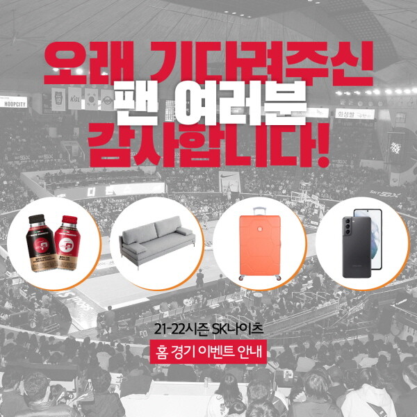 경기 중에는 KBL 앱과 SK나이츠 앱을 이용한 깜짝 이벤트를 통해 봄소와 소파, 수잇수잇 대형 캐리어, 삼성 휴대폰 등 다양한 경품을 선물로 증정한다. 경기 종료 후에는 경기장을 찾은 팬들에게 떙스 레터를 보내 감사의 인사를 전할 계획이다.