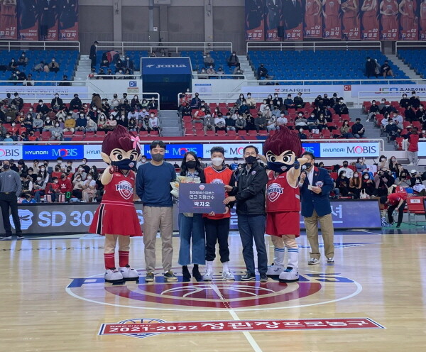 현대모비스는 26일 대구한국가스공사와의 홈경기 하프타임에 연고 선수 지명 행사를 가졌다. 2019년 김건하(화봉중3) 2021년 최재영(금명중3), 황서진(금명중2)에 이어 4번째 선택을 받은 박지오는 각종 대회에서 눈에 띄는 활약을 보이며 기량을 인정받았다.