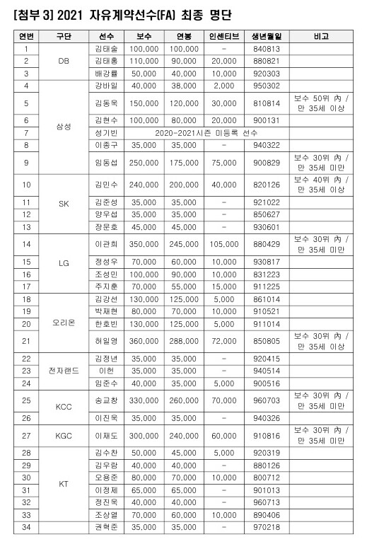 올 시즌 계약 만료 대상 선수 中 정준원(원주 DB)은 2020-2021 시즌 구단별 출전 가능 경기 1/2 미달에 따른 계약 연장, 김광철(서울 삼성)과 최성원(서울 SK)은 상무 입대로 인해 자유계약선수(FA) 명단에서 제외되고, 전주 KCC의 송교창과 안양 KGC인삼공사의 이재도 등 총 38명의 선수가 최종 공시됐다.