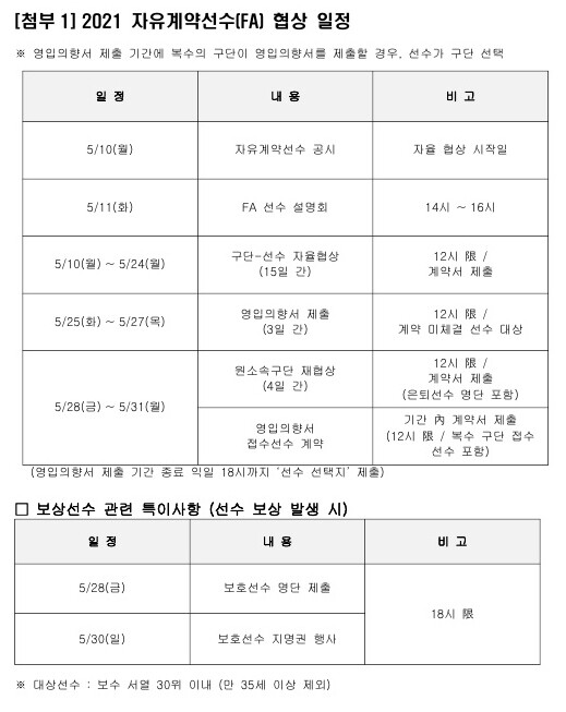 자유계약선수(FA) 대상자인 38명의 선수들은 5월 10일(월)부터 24일(월)까지 10개 구단과 자율 협상을 진행한다. 아울러 5월 11일(화) 2시부터 논현동 KBL 센터 5층 교육장에서 ‘FA 설명회’가 열린다.